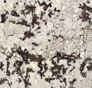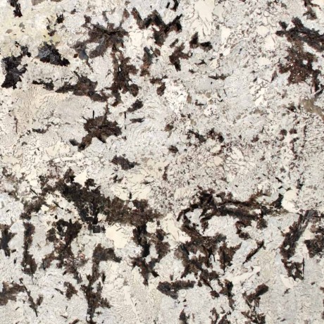Royal White granite features striking black feathering, crystal deposits and reflective swatches on a sophisticated white background.Available Sizes